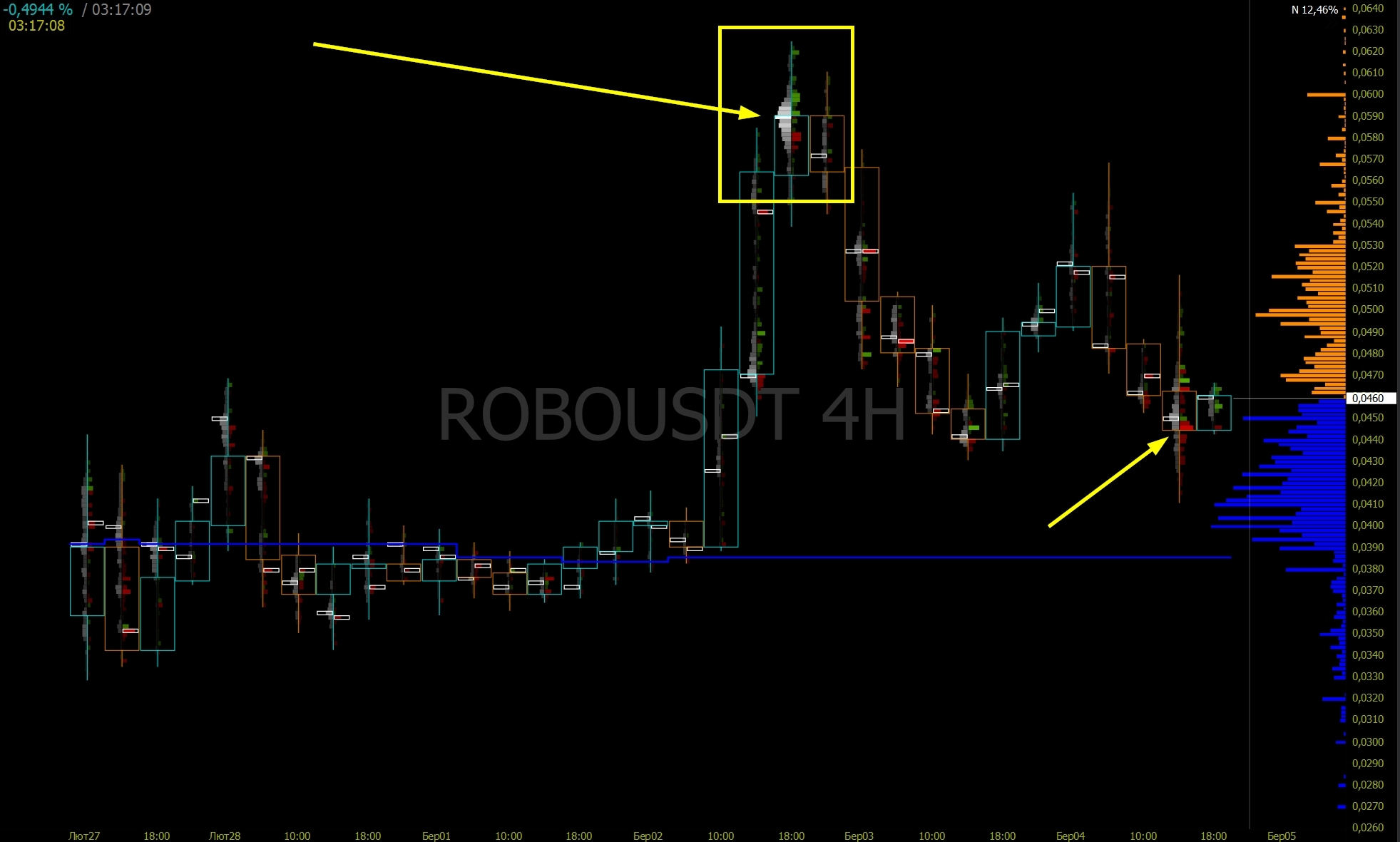 The largest volume cluster (in the yellow square) with a green delta indicates that long positions were blocked there, and this level is attractive to buyers for selling their coins.