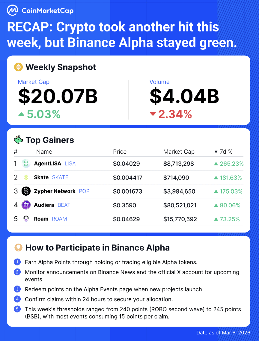Binance Alpha đã ghi nhận một hiệu suất kiên cường cho tuần kết thúc vào ngày 6 tháng 3 năm 2026, với mức tăng 5,03% trong tổng vốn hóa thị trường, đạt 20,07 tỷ đô la, ngay cả khi thị trường crypto rộng lớn hơn phải đối mặt với áp lực bán lại, theo CoinMarketCap.
