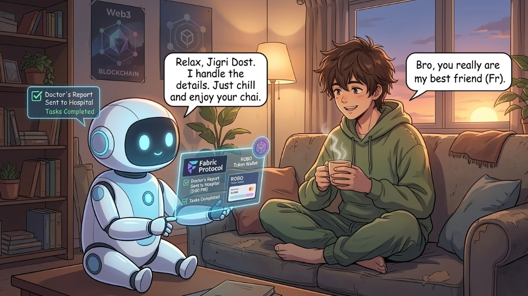 Đó là nơi Fabric Protocol xuất hiện. Về cơ bản, nó cung cấp cho robot ví riêng của chúng, ID riêng của chúng, tiền thật. Vấn đề blockchain. Không có trung gian lấy phần trăm. Chỉ có token ROBO.
