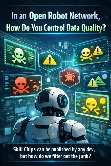 Nếu robot có thể chia sẻ kỹ năng giống như cách phần mềm chia sẻ plugin thì nguy cơ xuất hiện dữ liệu rác(junk data) gần như là điều khó mà tránh khỏi. Trong một hệ thống phi tập trung, bất kỳ dev nào cũng có thể xuất bản Skill Chips. Điều này tạo ra môi trường rất thuận lợi cho đổi mới. Nhưng mặt còn lại là mạng lưới cũng có thể nhanh chóng bị lấp đầy bởi những thứ vô giá trị hoặc thậm chí là những mô đun khiến robot hoạt động sai.