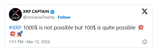 In the post, XRP Captain wrote that a $1,000 price target for XRP is “not possible,” but added that $100 is “quite possible.” The comment directly addressed a common topic in the cryptocurrency community, where some market participants promote significantly higher valuations based on long-term adoption scenarios.