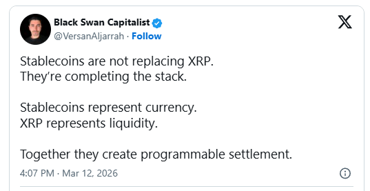Aljarrah wrote, “Stablecoins are not replacing XRP. They’re completing the stack.” He then clarified the distinction between the two asset types, explaining that stablecoins function primarily as digital representations of currency, while XRP provides liquidity that facilitates the movement of value.