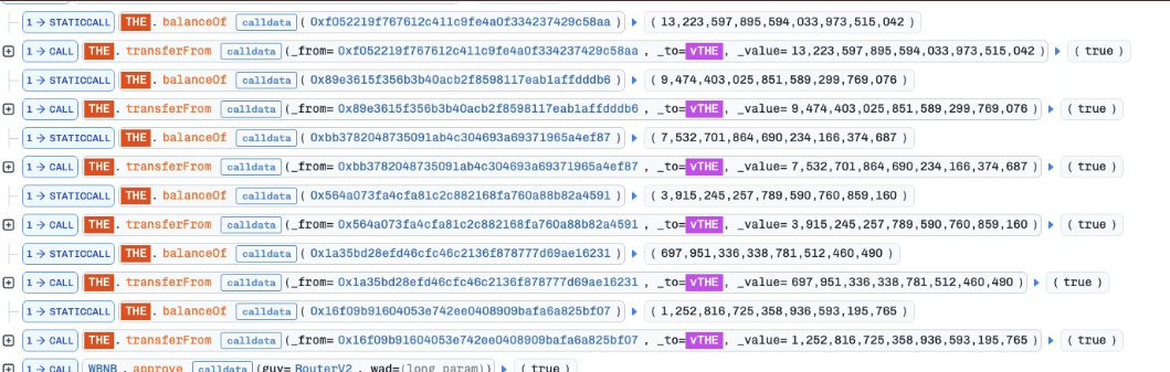 也就是在大量存入 THE 之后,直接向 vTHE 合约转账 THE,通过“捐赠”方式继续抬高可被系统识别的抵押价值,进一步突破上限。