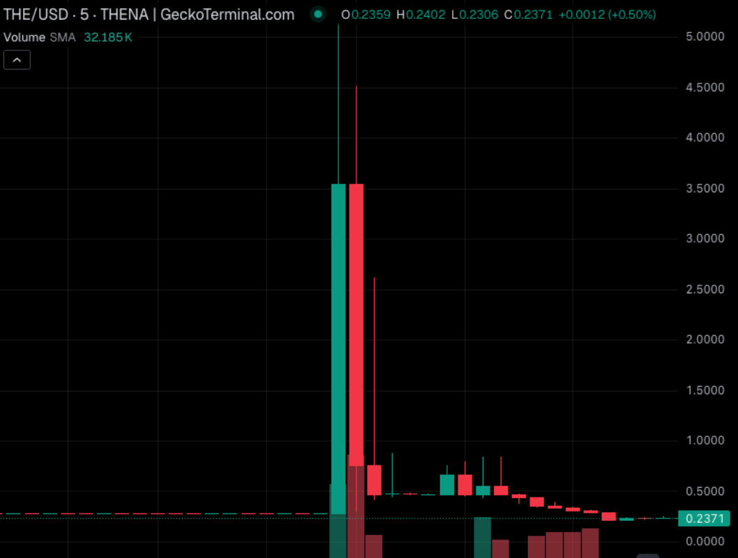 由于 THE 链上流动性极差,价格被从 $0.27 硬生生拉到 接近 $5。