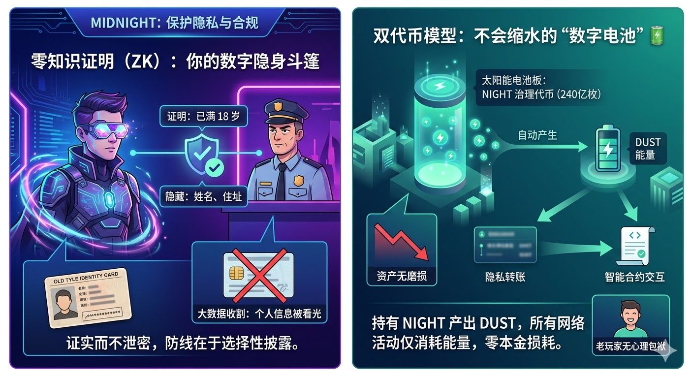 老玩家都有过这种痛:链上转个账,手续费(Gas)贵得心滴血,还没赚钱先亏了本金。Midnight 引入了 $NIGHT 与 DUST 的共生关系:NIGHT 是治理代币,DUST 则是交互能量。