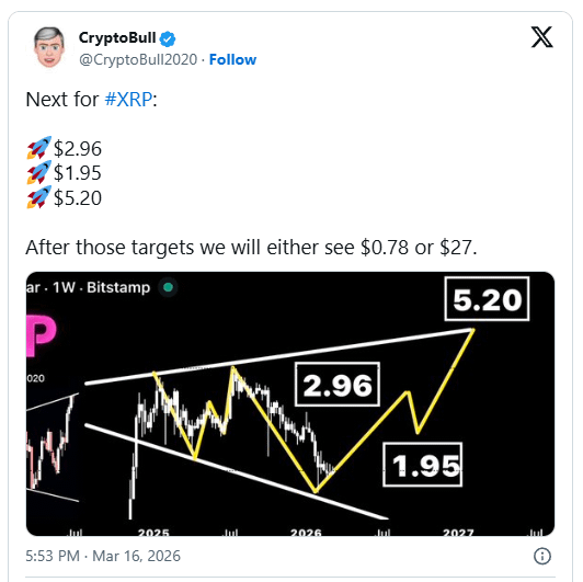 The chart in the post shows XRP trading within a broad descending channel formation following a previous upward move. According to the analyst’s projection, the asset may move through a sequence of levels before determining its longer-term direction. CryptoBull shared three primary targets he believes could appear next in the market structure.