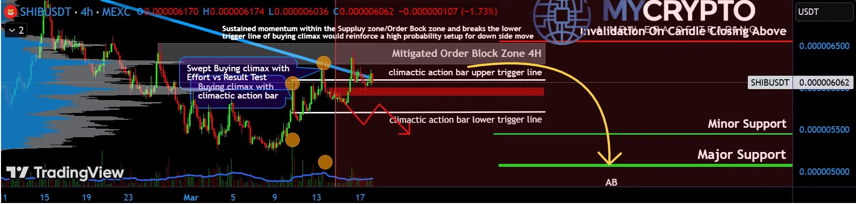 Multiple failed attempts to break above the $0.0000065 resistance zone have reinforced it as a strong supply area. Each rejection confirms that demand remains insufficient to absorb selling pressure at this level. As long as SHIB trades below this boundary, the structure favors continuation to the downside rather than a recovery toward higher targets.