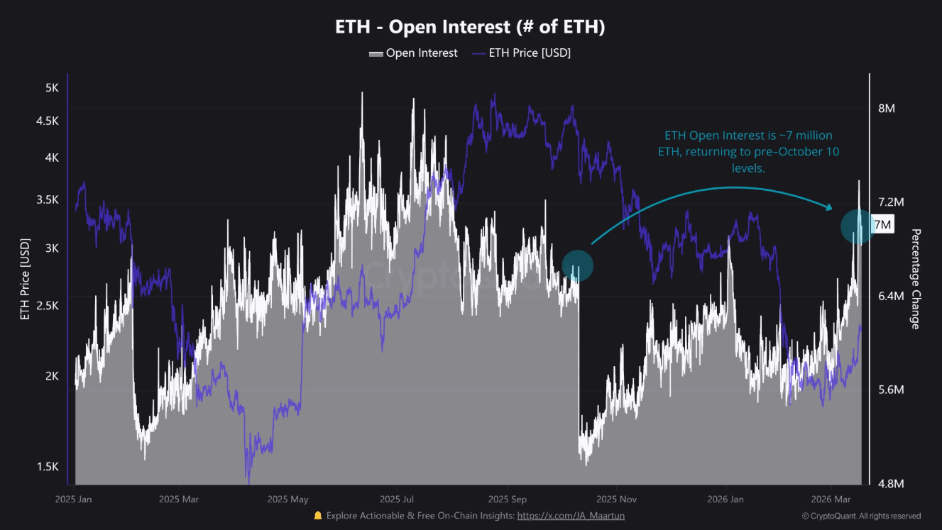 Ethereum's derivatives market is flashing a familiar warning sign. Open interest has climbed back to roughly 7 million ETH, matching the same threshold that preceded a major liquidation cascade just months ago. Despite a moderate price recovery, the speed of leverage rebuilding suggests the market may be repricing risk faster than traders realize.