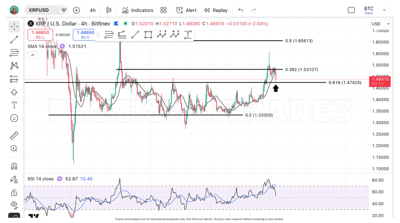 $XRP retests $1.47 macro 0.618 Fibonacci support. The reaction at this golden ratio level could define the next directional move.