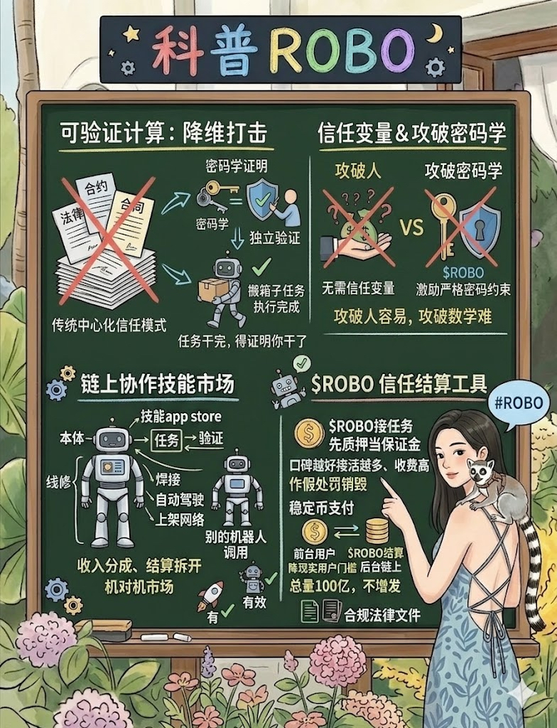 白皮书里讲的可验证计算,用大白话就是:任务执行过程中,顺带生成一段密码学证明。这段证明像数学题答案,谁都能独立验证,没法伪造。任何人拿来看,都只能得出同一个结论,任务确实执行了,结果是真实的。想明白之后我愣了一下。之前我把这个项目的代币$ROBO 简单理解成“机器人经济里的消耗资产”,跟真实工作挂钩。现在我觉得更准确的说法是:它的使用和激励机制被密码学严格约束。没有证明,协议就不认,任何奖励都不会触发。这就把“信任”这个变量彻底去掉了,防作恶靠数学和代码,而不是靠人盯人。这也是为什么我觉得它是核心区别。过去两年AI+Web3项目很多,但大部分跟真实世界的连接是松散的。你说算力真贡献了、数据真有用,但没法独立验证,最后往往靠项目方说辞和社区共识。可如果Fabric这套“证明”逻辑真能落地,就是把“无需信任”这个理念在物理世界落地了。机器人干活靠可验证的证明,谁都能查,谁都赖不掉。想造假,得先攻破密码学。这条路最难,但也最干净。