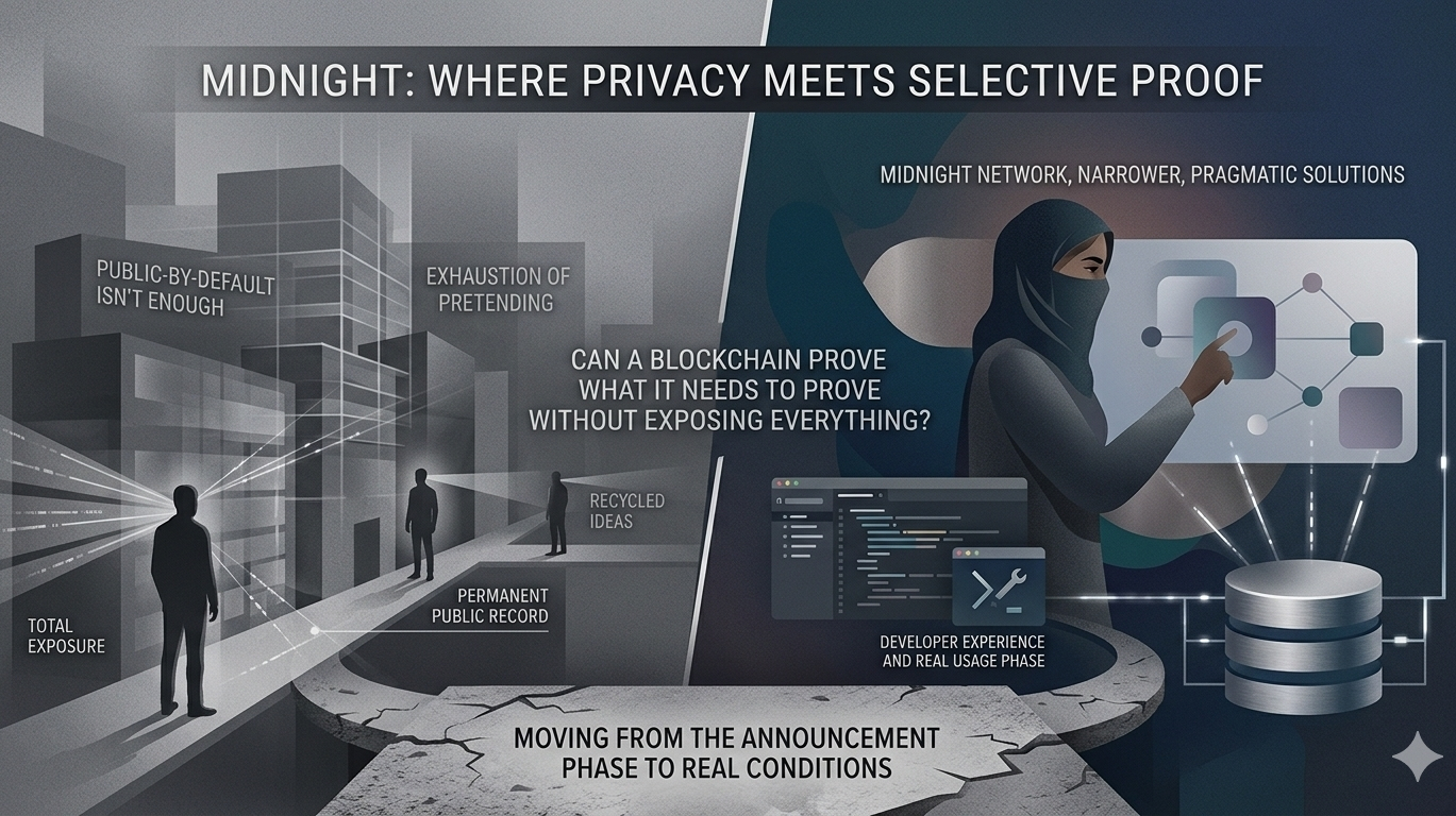 Bởi vì những dự án hẹp xử lý ma sát thực thường thú vị hơn những dự án lớn được xây dựng trên những lời hứa mơ hồ. Nửa đêm dường như hiểu rằng phiên bản hữu ích của quyền riêng tư không phải là kịch tính. Nó là cấu trúc. Nó là chọn lọc. Nó được xây dựng vào hệ thống tự nó, không phải gắn vào sau này vì mọi người cuối cùng nhận ra rằng thiết kế ban đầu quá phơi bày để sống chung.