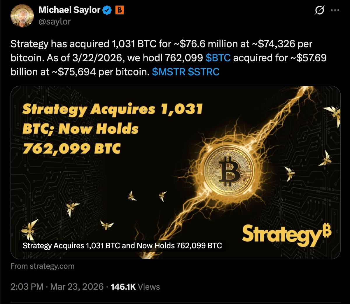 Strategy acquired 1,031 BTC for ~$76.6 million at ~$74,326 per coin, bringing total holdings to 762,099 BTC.