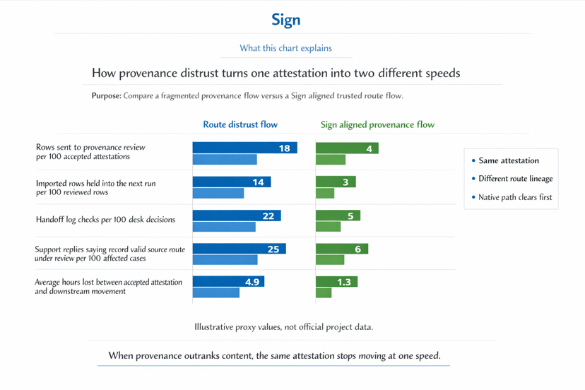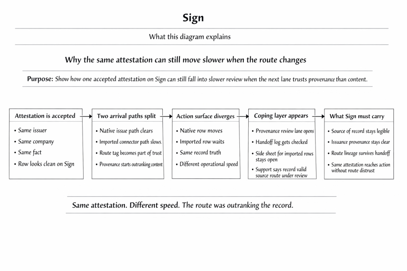 Trên Chữ ký, điều đó quan trọng hơn những gì mọi người thích thừa nhận. Lược đồ không chỉ mang hình dạng sự thật. Giấy chứng nhận không chỉ mang sự thật được hỗ trợ bởi người phát hành. Giao thức Chữ ký cũng mang theo, hoặc không mang theo, một câu trả lời có thể đọc được cho một câu hỏi khó hơn. Đây có phải là nguồn bản ghi mà làn đường tiếp theo đã tin tưởng chưa. Đây có phải là con đường phát hành mong đợi không. Đây có phải là cùng một bề mặt nguồn gốc mà logic hành động được xây dựng để tuân theo không. Nếu những câu trả lời đó vẫn mờ mịt, giấy chứng nhận có thể hợp lệ và dòng vẫn có thể cảm thấy sai ở chính nơi mà ai đó phải di chuyển nó.