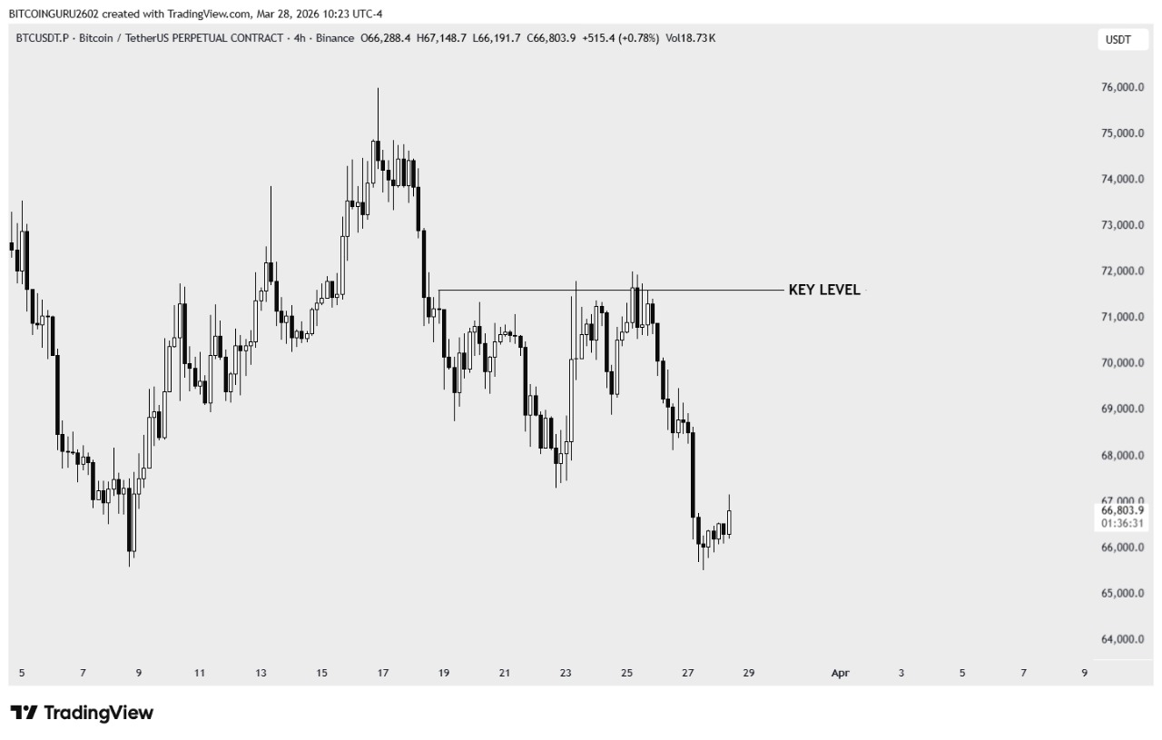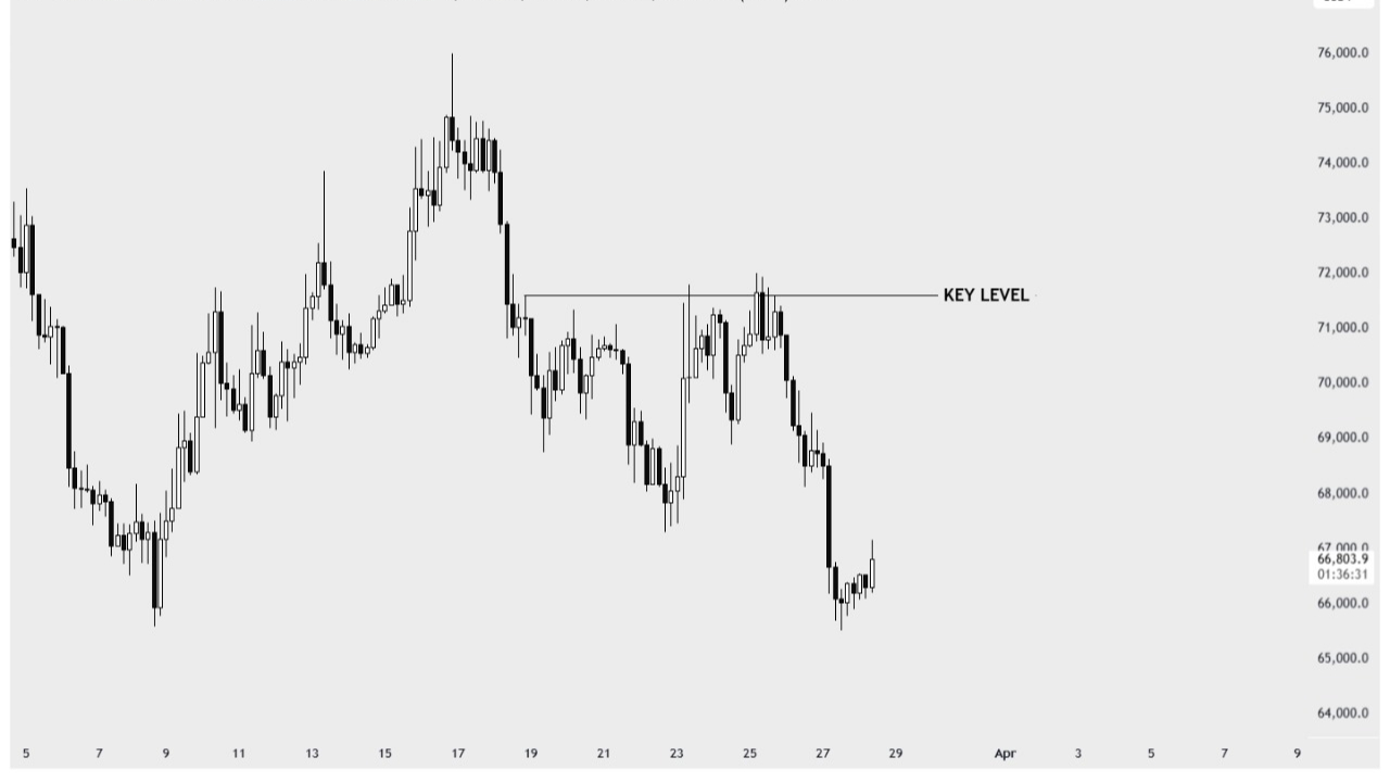Sau vài ngày cố gắng đẩy lên khu vực 71.000–72.000 USD, Bitcoin đã gặp lực bán khá mạnh. Điều đáng nói là giá không thể break hẳn lên trên để xác nhận một nhịp đi tiếp, mà ngược lại nhanh chóng bị đạp trở về vùng 66.000 USD.