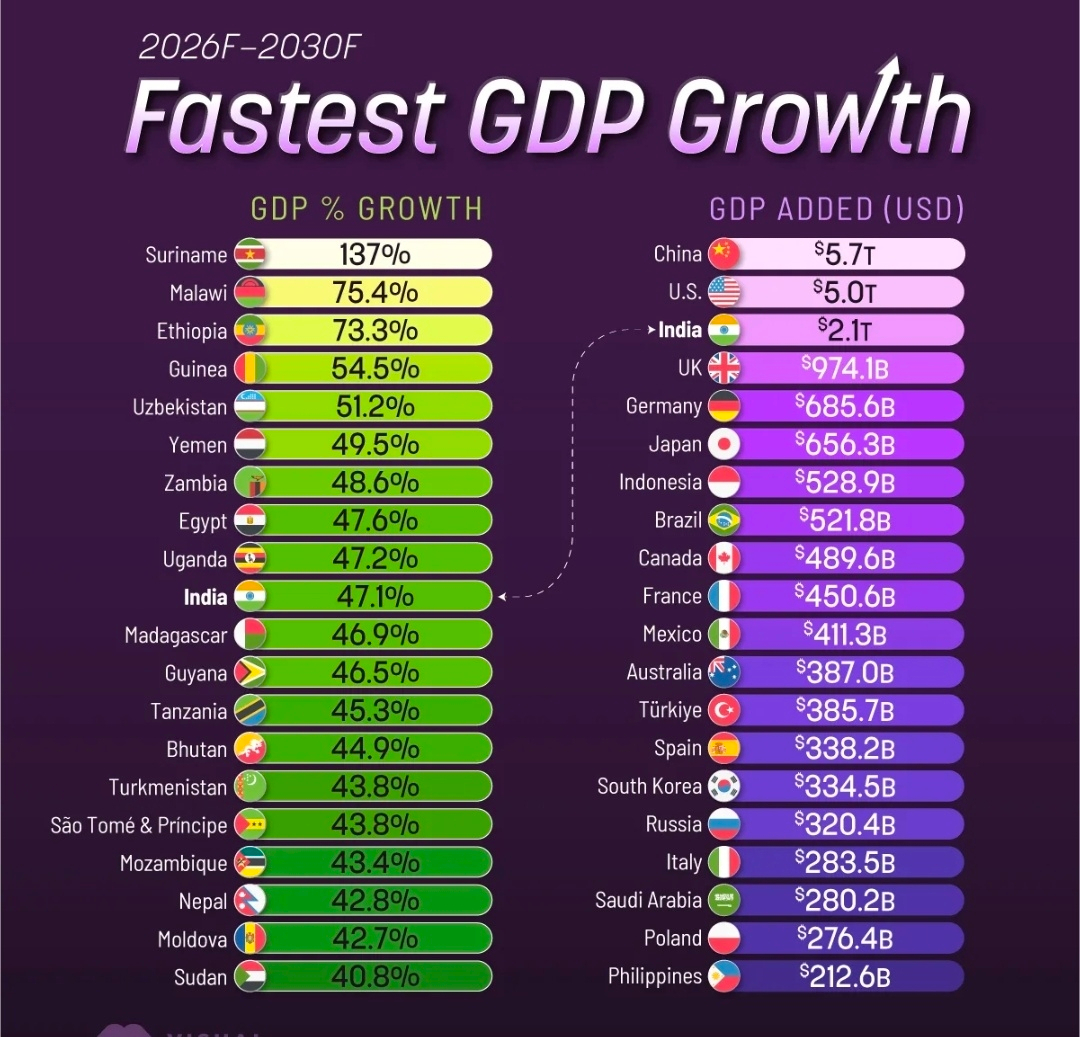 Trung Quốc (+$5,7T), Hoa Kỳ (+$5,0T), và Ấn Độ (+$2,1T) chiếm gần một nửa (49,7%) tổng GDP dự kiến sẽ tăng thêm đến năm 2030.