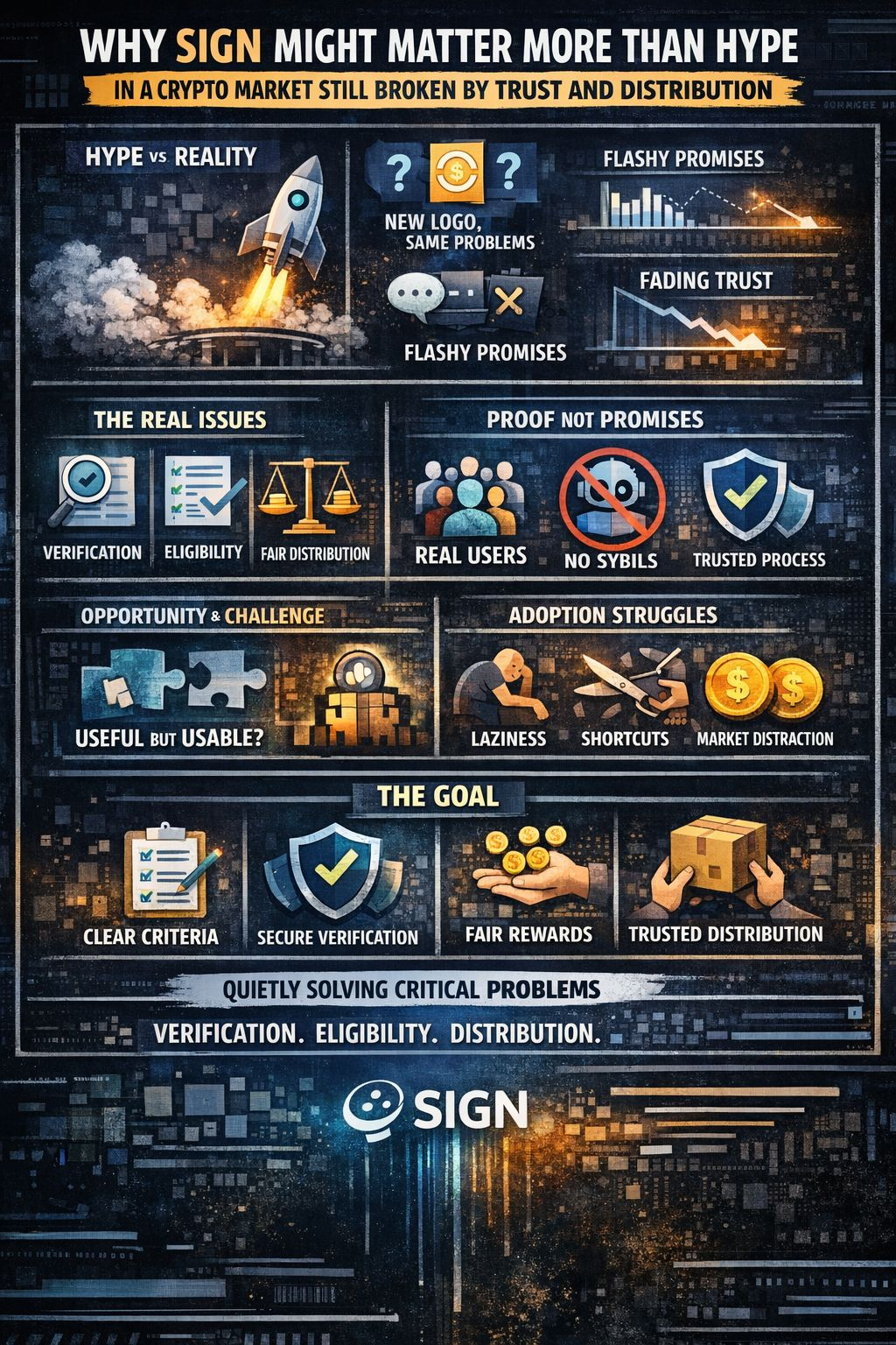 That said, I am not looking at it like some magic missing piece. Crypto does not get fixed in one move. It never works like that. Even if SIGN is building something genuinely useful, that still does not guarantee broad adoption. It does not guarantee teams will integrate it well. It does not guarantee users will care. It does not guarantee the market will value it for what it actually does instead of just treating it like another token to trade around.