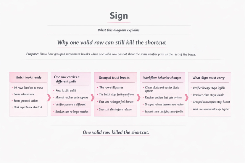 Tôi không nghĩ đây là một bài luận một hàng. Câu hỏi thực sự là liệu Giao thức Sign có thể duy trì đủ kỷ luật xác minh để các hàng hợp lệ vẫn an toàn khi di chuyển cùng nhau hay không. Đến lúc đó không ai thực sự đọc cái nhìn nhóm nữa. Một người đang quét ghi chú ngoại lệ. Một người khác đang kiểm tra bảng điều khiển giải quyết. Ai đó đã chuyển các hàng sạch vào khối riêng của họ vì không ai muốn giải thích sau này tại sao một hàng đường đi hỗn hợp lại được phép đi cùng phần còn lại. Đó là ý nghĩa. Giao thức vẫn giữ lô hàng. Căn phòng đã tách nó ra.