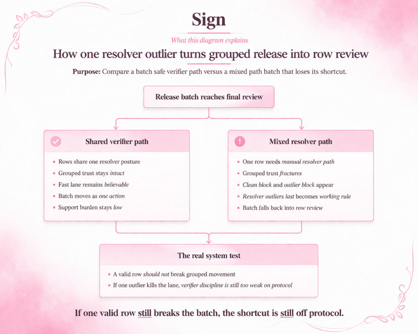 Kiểm tra rất đơn giản. Lấy một lô hàng hợp lệ và xem điều gì xảy ra khi một trong số chúng không thể chia sẻ cùng một con đường xác minh như phần còn lại. Lối đi nhanh có tồn tại không. Các bảng ngoại lệ giải quyết có vẫn hiếm không. Các phát hành nhóm có vẫn được nhóm lại không. Hay một hàng chấp nhận duy trì việc biến lối tắt thành nhà hát vì bàn không còn tin rằng lô hàng có nghĩa là một điều.