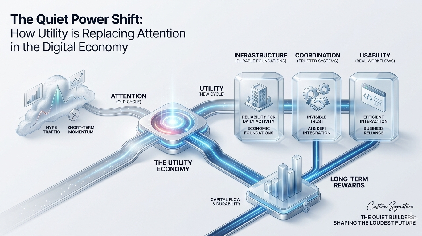 Các thị trường đang dần học được bài học này. Sự đầu cơ ngắn hạn vẫn tồn tại nhưng vốn đang ngày càng thưởng cho sự bền vững. Những dự án cho phép phối hợp, xác minh và tương tác hiệu quả đang thu hút sự chú ý không phải vì chúng nổi bật ồn ào mà vì chúng giảm bớt sự cản trở qua nền kinh tế kỹ thuật số. Tính hữu dụng, từng bị xem nhẹ, đang âm thầm trở thành câu chuyện mạnh mẽ nhất trong tất cả.