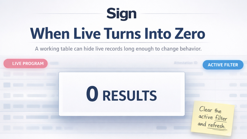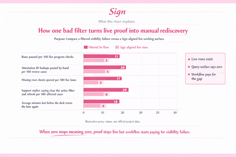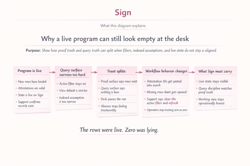 Trên Sign, bề mặt bằng chứng vẫn có thể đúng trong khi bề mặt truy vấn đang nói dối về mặt vận hành. Sự chứng thực tồn tại. Người phát hành vẫn ổn. Lược đồ ổn. Trạng thái đang sống. Nhưng nếu các trường mà bàn lọc theo hẹp hơn trạng thái chương trình thực tế, hoặc giả định trạng thái hoạt động nghiêm ngặt hơn các hàng đang đến, bảng bắt đầu dạy mọi người tin tưởng vào một sự vắng mặt không thực.