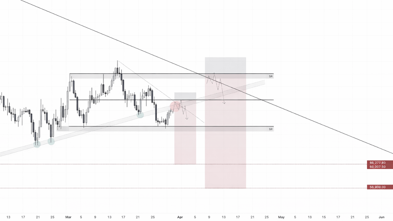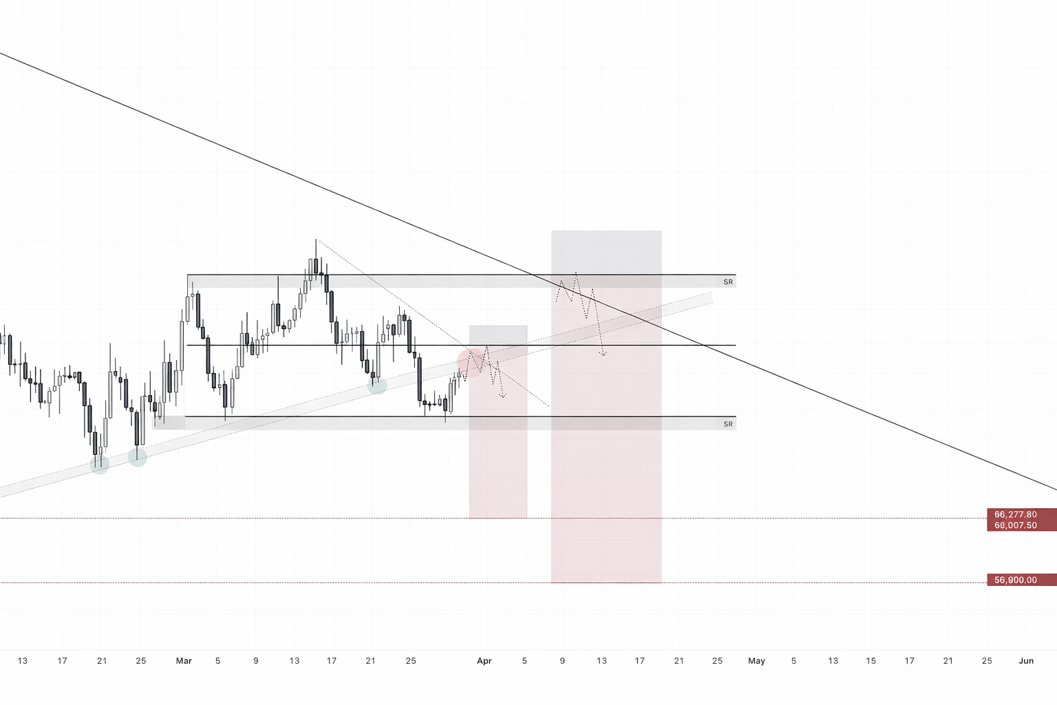 Kịch bản mình đang ưu tiên vẫn là chờ giá hồi lên các vùng tốt hơn để tìm cơ hội short. Khu vực đầu tiên mình theo dõi là $69.500–$70.000. Nếu lực đẩy đủ mạnh và giá vượt qua vùng này, vùng tiếp theo mình quan sát sẽ là quanh $74k. Đó là những khu vực mình thấy tỷ lệ risk/reward hợp lý hơn cho phe bán nếu cấu trúc chưa thay đổi rõ ràng.