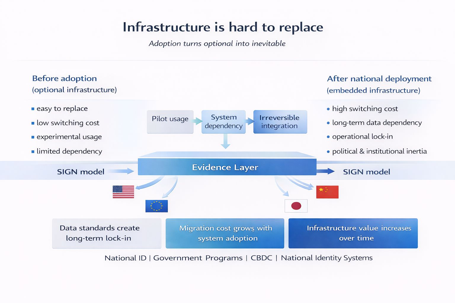 Một điểm nữa mình nghĩ khá nhiều là về $SIGN. Bình thường mấy token hạ tầng hay rơi vào kiểu phải có adoption thì mới có value, mà adoption lại phụ thuộc vào token. Nhưng với Sign thì nếu một quốc gia đã dùng schema và attestation của họ trong vài năm, thì gần như không thể migrate sang hệ khác mà không phá vỡ toàn bộ dữ liệu cũ.