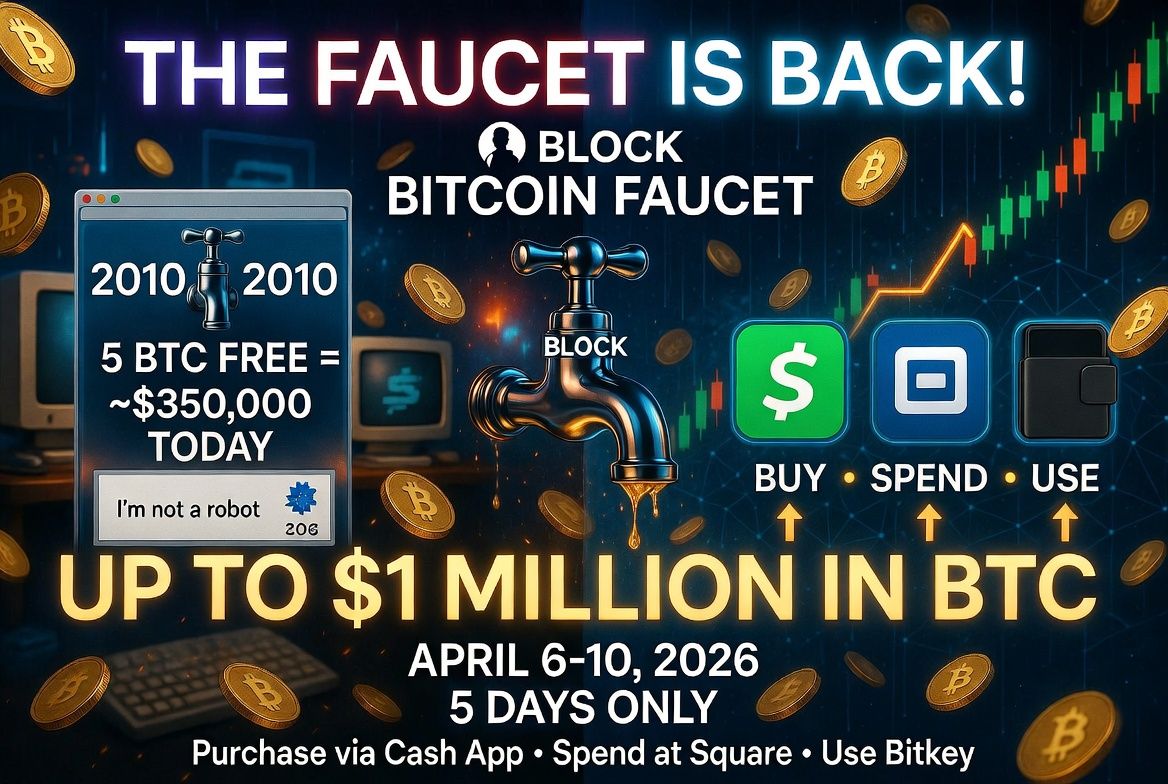 The “Bitcoin Faucet” campaign at BTC is reported to distribute up to $1 million USD in BTC between April 6–10, 2026, and will link rewards to Cash App, Square, and Bitkey. Further monitoring is needed regarding the official terms from Block concerning the reward amount, payout method, and eligibility criteria.