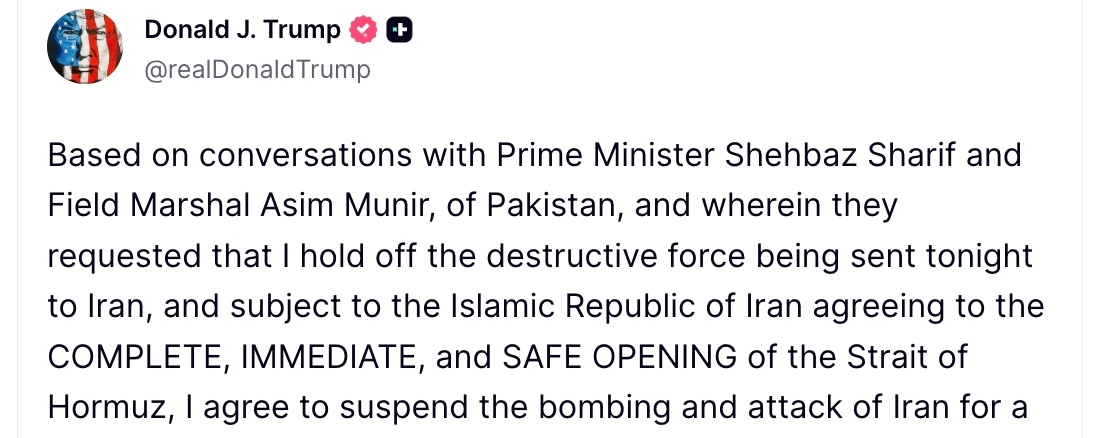 Trump confirmed a 2-week suspension of bombing operations against Iran.