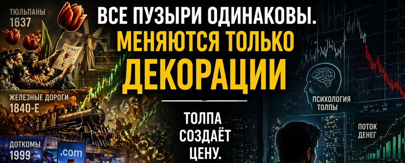 За последние 300 лет менялись активы, но не менялась логика. От Tulip Mania до Dot-com bubble и текущего крипторынка — каждый цикл начинается с идеи и заканчивается психологией.