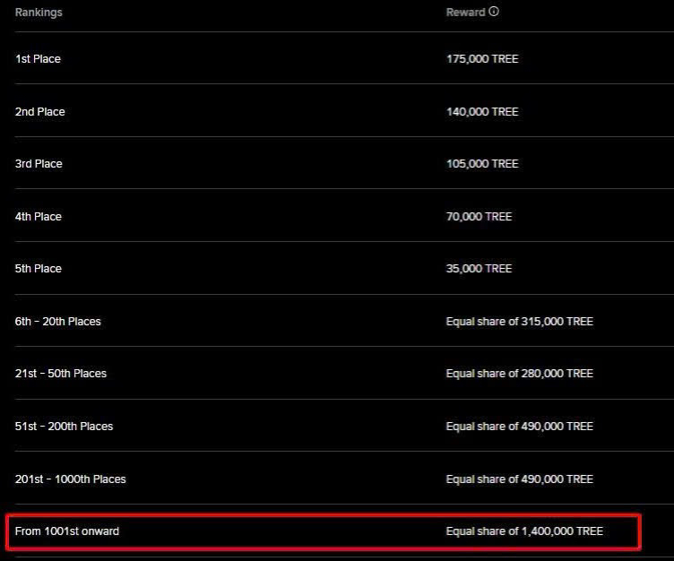 Nếu bạn không có ý định cạnh tranh cho các vị trí hàng đầu, đừng bỏ lỡ—chỉ cần thực hiện một giao dịch bằng cách mua 251U và sau đó bán nó để nhận được một phần của tổng cộng 1,400,000 mã thông báo TREE được phân phối cho tất cả người tham gia.