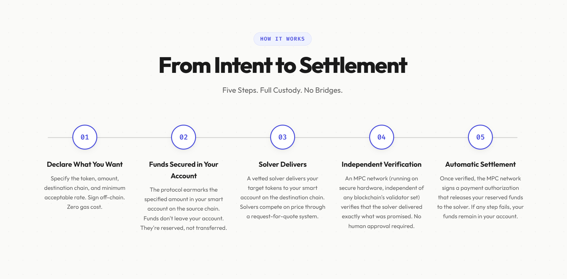 Dưới nắp, một mạng lưới MPC xác minh rằng người giải quyết đã cung cấp kết quả mong đợi trước khi bất kỳ việc giải quyết nào được hoàn tất. Điều đó loại bỏ nhu cầu về sự tin cậy thủ công trong khi giữ cho quy trình minh bạch và có thể thực thi trên chuỗi.
