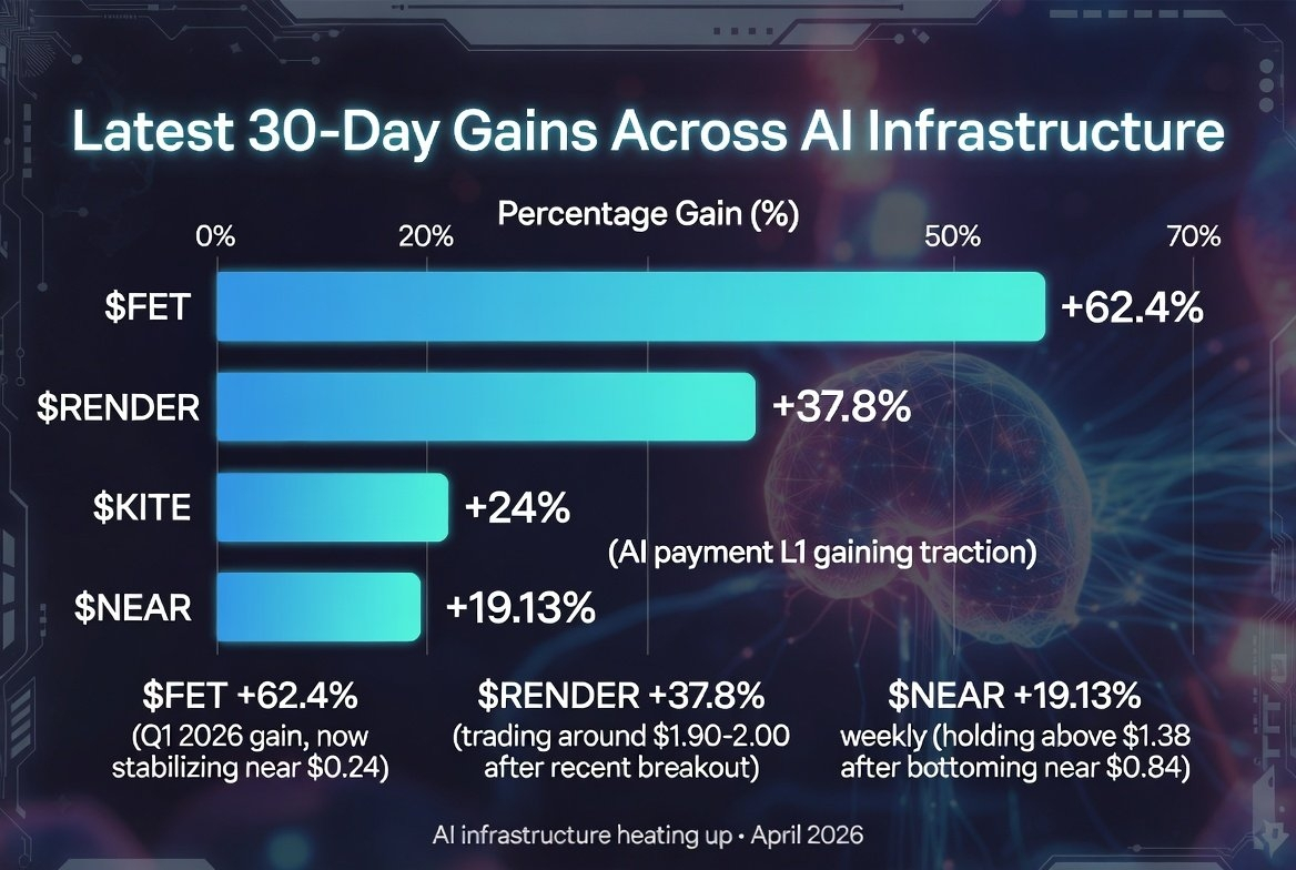 🔸 $FET dẫn đầu với mức tăng 62.4% trong Q1/2026, hiện đang ổn định quanh mức $0.24 sau một sự bùng nổ mạnh mẽ.