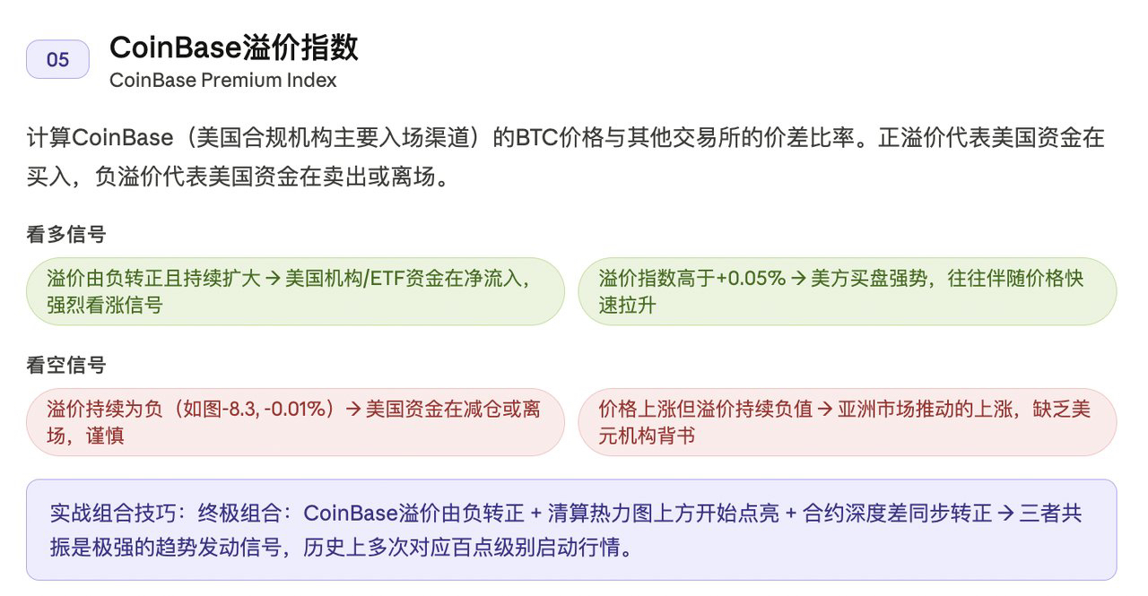 在2024年1月比特币ETF通过前后,以及2024年3月的高点行情中,CoinBase溢价在上涨前提前1-2小时转正,是非常有效的"打第一枪"信号。当然,假信号同样存在,需要配合其他指标交叉确认。
