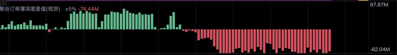 如图所示当前现货深度差为 -74.44M(负7444万美元),意思是±5%区间内,卖单比买单多出了约7444万美元。这个量级代表当前买方若想推价格向上,需要消耗掉这部分卖盘。数字越大(绝对值),阻力/支撑越坚实。