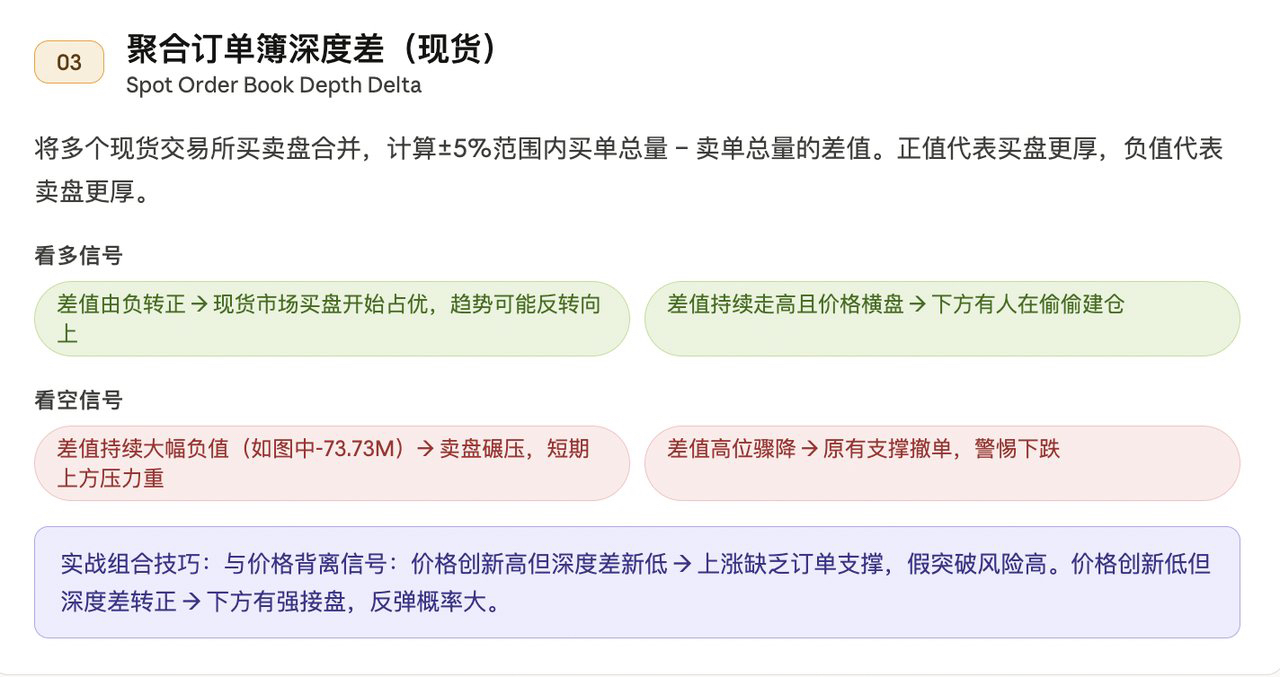 这个指标只统计当前价格±5%范围内的挂单差值,这是"有效流动性带"——超过5%的挂单被市价消化的概率很低,对短期价格影响有限。