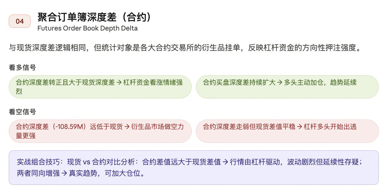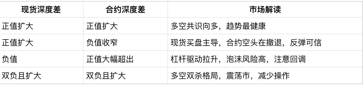 现货深度差合约深度差市场解读正值扩大正值扩大多空共识向多,趋势最健康正值扩大负值收窄现货买盘主导,合约空头在撤退,反弹可信负值正值大幅超出杠杆驱动拉升,泡沫风险高,注意回调双负且扩大双负且扩大多空双杀格局,震荡市,减少操作