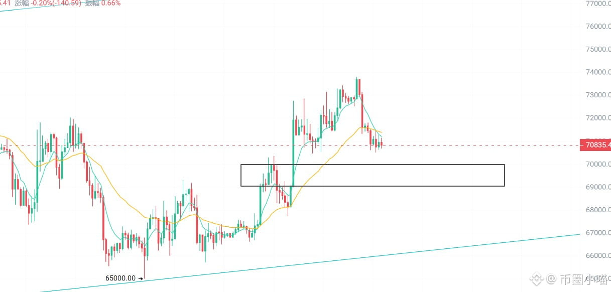 $BTC :比特币短线支撑集中在6.9万—7万一带,日内已经多次测试,一旦有效跌破,不排除再次回探6.8万附近。但整体结构来看,这一带依然具备承接能力,可以作为分批布局的参考区域,大方向依旧偏多,本月上方目标依然关注7.6万—8万区间。