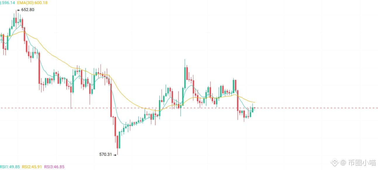 最后简单看一下 BNB。当前价格在596美元附近,整体处在震荡整理阶段。技术面上趋势强度已经逐渐增强,但仍受到50日均线压制,下方575附近有支撑,上方更大的压力在670美元一带。短期来看,大概率还是以震荡蓄势为主,等待新的方向选择。