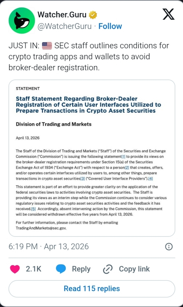 The United States SEC has issued new guidance outlining conditions for crypto trading apps and wallets to avoid broker-dealer registration. Per a press release, the securities agency concludes software that clears the way for securities transactions with individual wallets won’t trip regulations.