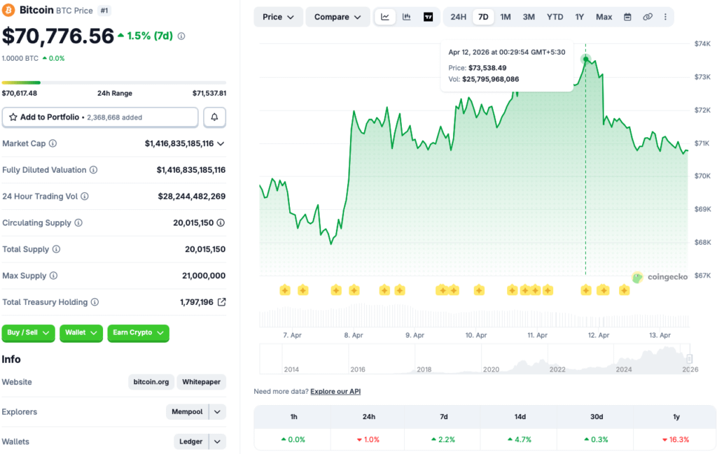 Thị trường tiền điện tử đã cho thấy một số dấu hiệu phục hồi ngay trước khi Mỹ và Iran đồng ý tổ chức các cuộc đàm phán. Tuy nhiên, các cuộc đàm phán không thành công, và các nhà đầu tư lo ngại về tình trạng leo thang trở lại. Theo dữ liệu của CoinGecko, giá BTC đã giảm 1% trong 24 giờ qua và 16.3% kể từ tháng 4 năm 2025. Tuy nhiên, đồng tiền điện tử gốc vẫn duy trì một số mức tăng trong các khung thời gian khác, tăng 2.2% trong tuần trước, 4.7% trong biểu đồ 14 ngày, và 0.3% trong tháng trước.