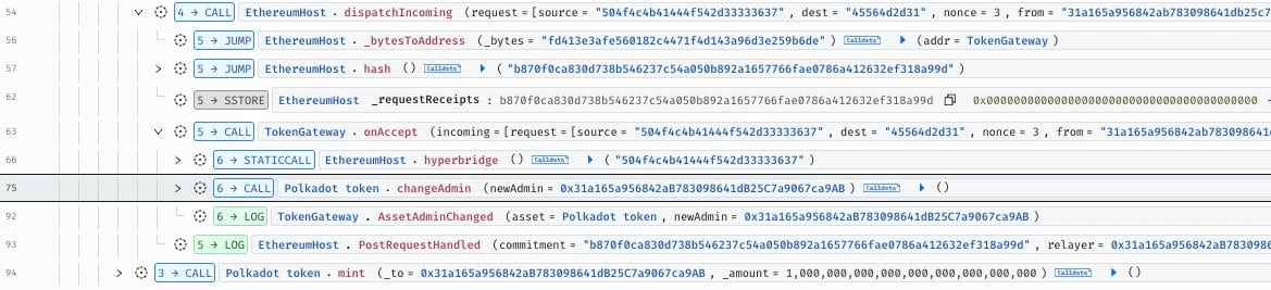 🔹 Kẻ tấn công đã giả mạo một thông điệp xuyên chuỗi thông qua Giao thức Máy trạng thái Tương tác (ISMP) để qua mặt xác minh bằng chứng trạng thái và giành quyền kiểm soát quản trị đối với hợp đồng DOT trên Ethereum. Tuy nhiên, thanh khoản mỏng trong nhóm DOT trên Ethereum đã hạn chế đáng kể khả năng rút tiền của kẻ tấn công. Các token $DOT gốc và các cầu nối Polkadot khác hoàn toàn an toàn và không bị ảnh hưởng.