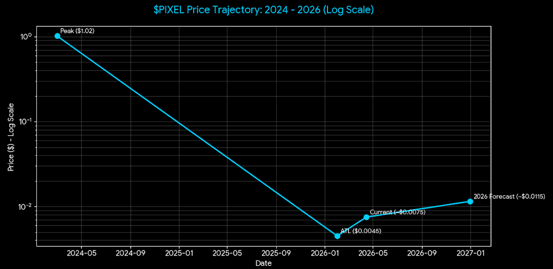The Price I'm not going to sugarcoat this. PIXEL hit an all-time high of $1.02 back in March 2024 and today it's trading around $0.007 to $0.008. That's a brutal drop of over 99% from peak.