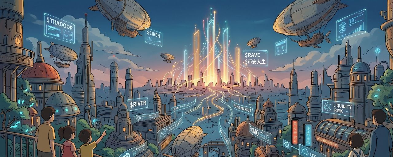 本轮行情的另一显著特征是资金在不同项目间的快速轮动。当市场焦点集中在$RAVE时,$TRADOOR等早期项目往往在低调中完成筹码调整;$SIREN的AI叙事退潮后,音乐/慈善或中文情绪主题迅速接棒。这种注意力周期通常以几天为单位,Alpha实时榜单成为资金切换的风向标。早期空投参与者常在低位实现显著收益,进一步放大了“错过即亏大”的FOMO心理,推动下一轮热点形成。