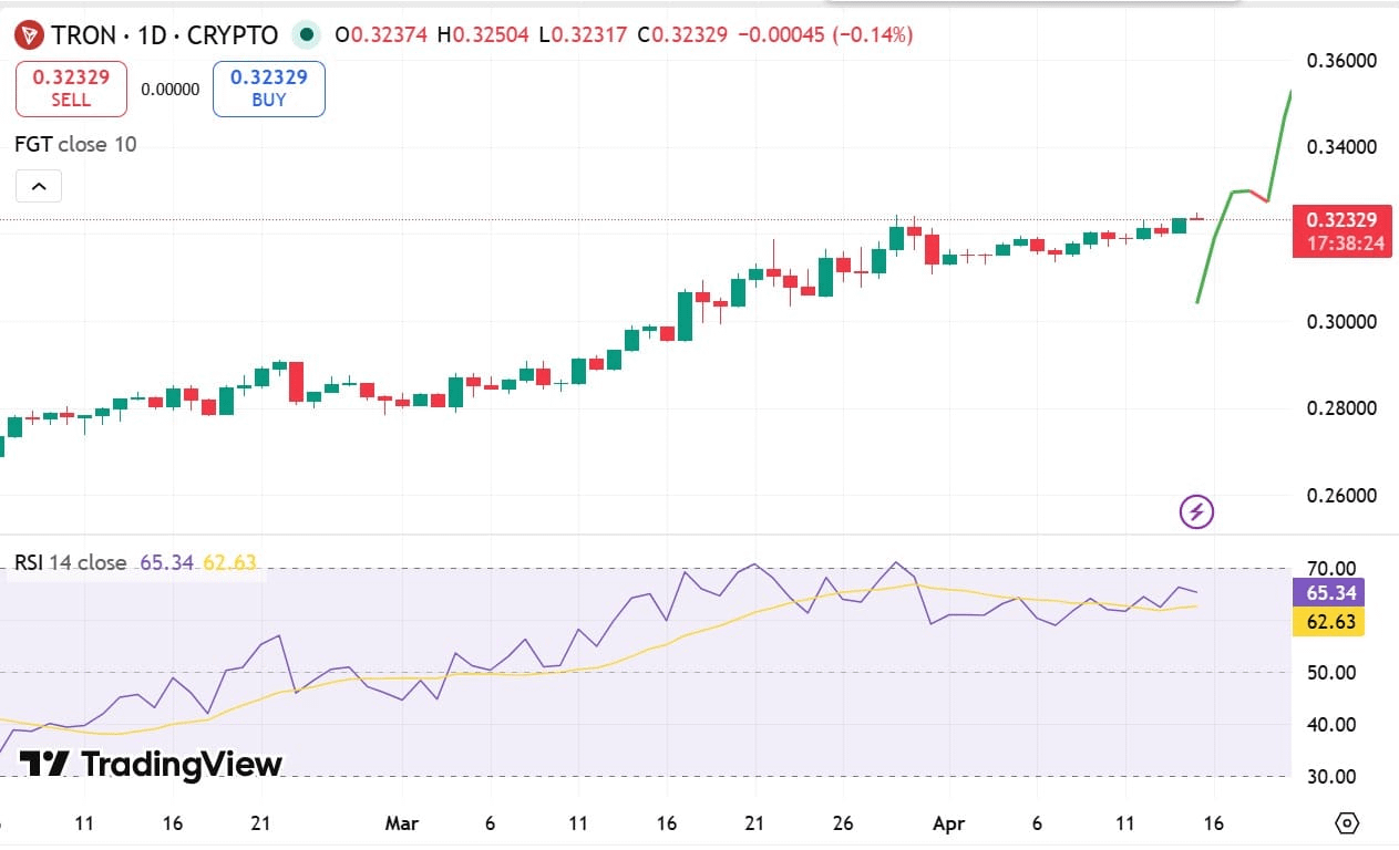 🔹 Được thúc đẩy bởi tâm lý tích cực này, TRX đã chạm mức cao nhất trong hai tuần là 0,325 USD trước khi ổn định gần 0,323 USD. Chỉ số Sức mạnh Tương đối (RSI) của altcoin này đang dao động quanh mức 65, cho thấy nhu cầu ổn định và phe mua đang kiểm soát. Nếu đà tăng này được giữ vững và lật ngược hoàn toàn mức kháng cự 0,32 USD, các dự báo kỹ thuật cho thấy một đợt phục hồi tiếp diễn hướng tới mục tiêu 0,36 USD.