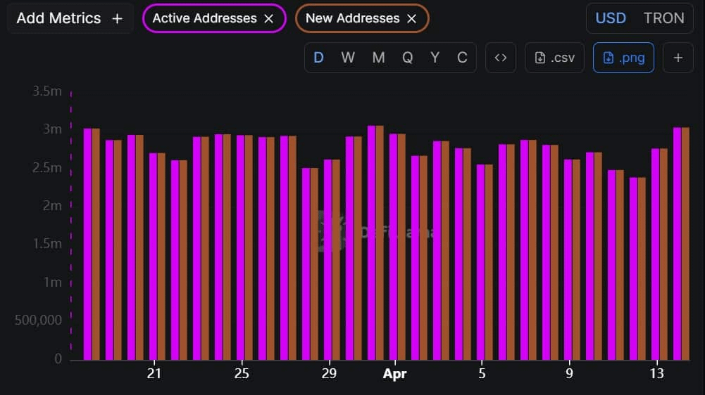 🔸 Thông báo này trùng hợp với giai đoạn tăng trưởng mạnh mẽ của mạng lưới. Các địa chỉ hoạt động của Tron đã tăng vọt lên mức cao nhất trong hai tuần là 3,04 triệu vào ngày 15 tháng 4, đánh dấu một bước nhảy vọt đáng kể từ 2,7 triệu chỉ một ngày trước đó, báo hiệu rằng các phát triển bảo mật chủ động đang thu hút những người tham gia thị trường lớn.