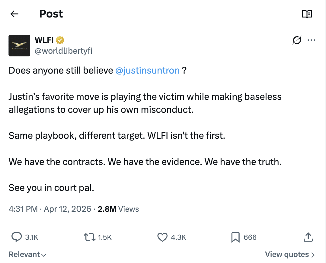 🔹 Quá trình tái cấu trúc diễn ra sau khi dữ liệu on-chain cho thấy dự án đã sử dụng 5 tỷ token WLFI làm tài sản thế chấp để vay hơn 75 triệu USDC, gây lo ngại về tính thanh khoản. Cùng lúc đó, Justin Sun cáo buộc rằng WLFI đã nhúng các chức năng danh sách đen không được công bố vào các hợp đồng token để đóng băng tiền của người dùng. WLFI đã kiên quyết phủ nhận các cáo buộc này là vô căn cứ và tuyên bố sẵn sàng bảo vệ lập trường của mình trước tòa.