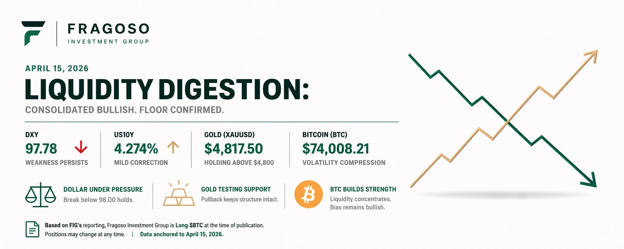 Data anchored to April 15, 2026. The DXY remains weak (97.78), validating yesterday’s breakdown. The US10Y is showing a mild technical correction (4.274). Gold and BTC are carrying out textbook technical pullbacks into their new support zones after the PPI release, while keeping their short- and medium-term bullish structures intact.