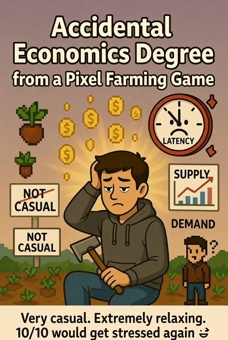 Instead I ended up @Pixels analyzing resource scarcity, time-value-of-money, supply/demand mechanics, and psychological nudges — all while my character just stood in a field holding a pixel hoe like a confused salaryman.