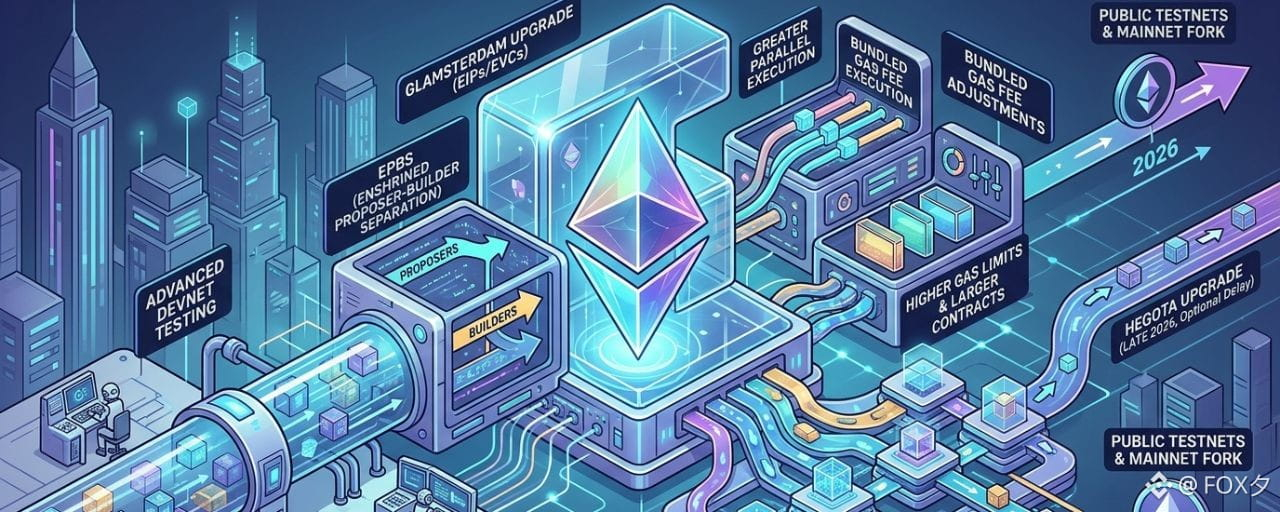 Ethereum’s next major upgrade, Glamsterdam, is now moving beyond the roadmap stage into real implementation as it enters advanced devnet testing. Core developers are currently focused on stabilizing all major features inside a more generalized testing environment, especially ePBS and bundled gas fee adjustments, before pushing it toward public testnets and eventually a mainnet fork. This signals that Ethereum’s discussion has shifted from high-level design into serious cross-client technical validation.