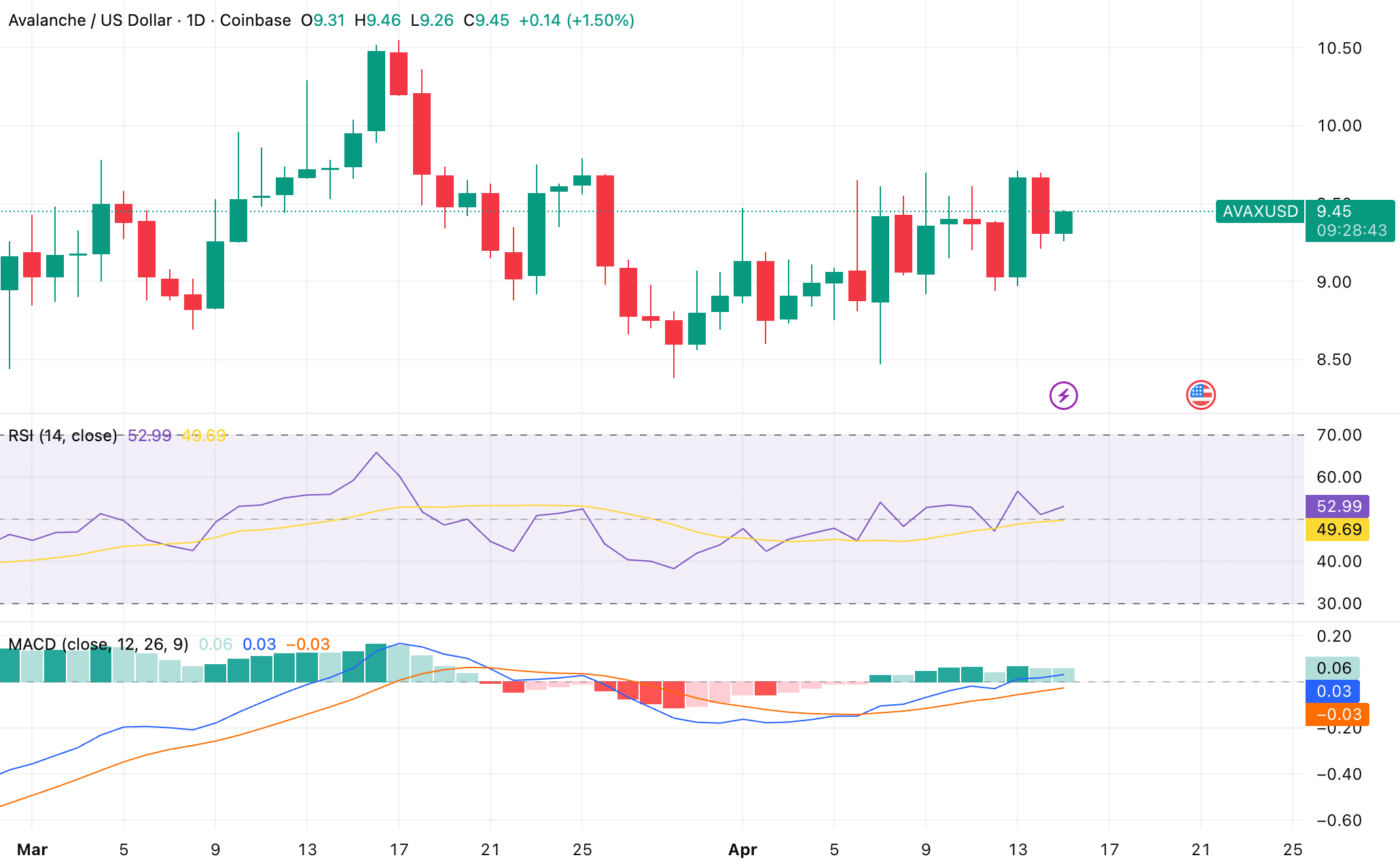 🔸 Hành động giá phản ánh sự do dự này của thị trường. $AVAX hiện đang giao dịch quanh mức 9,45 USD, phục hồi nhẹ sau đợt sụt giảm đầu tháng 4 gần vùng 8,50–8,70 USD. Cấu trúc rộng hơn vẫn đi ngang, phải đối mặt với một rào cản kháng cự rõ ràng gần 10,50 USD.